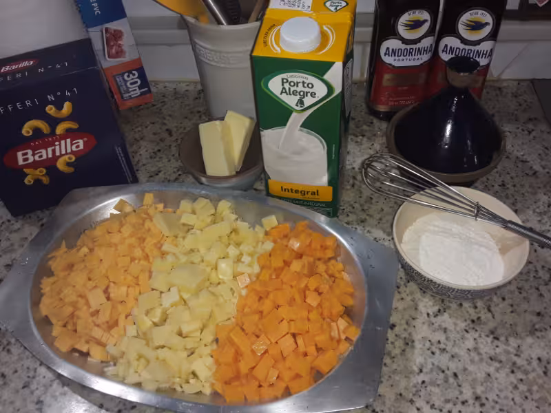 I bought cheddar, mozzarella and a cheese we call prato that seems to be somewhat similar to American colby cheese... I usually do this cheese sauce using gorgonzola and it's great. I tried with those other cheese because of the pasta I bought and thought about trying to make something similar to Mac and Cheese.